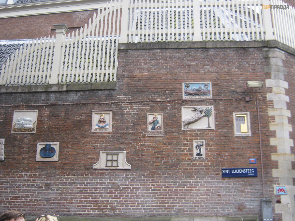 Существует специальная комиссия, которая обследует эти дома. Состояние опорных балок (а они у них тоже деревянные, как и в Венеции, т. к. город стоит на болотистых грунтах) измеряют специальными приборами и, если, упаси Бог, какая-то из них подгнила, поднимают целый дом специальными машинами и меняют эту балку. В ходе многочисленных реставраций с домов снимают и сохраняют вот такие таблички,