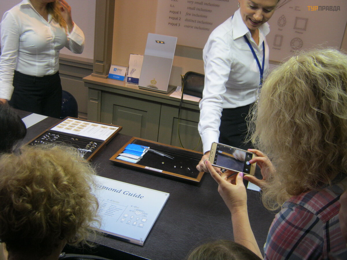 Самый недорогой камушек стартует от 240 евро и вес его измеряется даже не в каратах! После небольшого мастер-класса по обработке бриллиантов, нашу группу заводят в отдельную комнату, где выносят разнообразные камушки как отдельно, так и в изделиях. Некоторые изделия вполне приемлемы по цене: например, часы с одним небольшим бриллиантиком стоят 100 евро. Но самое приятное, особенно для женщин, что все ювелирные украшения дают мерять, независимо от того, сколько денег у тебя в кармане. Такой вот рекламный ход! Наша группа там основательно зависла! Многим, оказывается, нравится мерять!