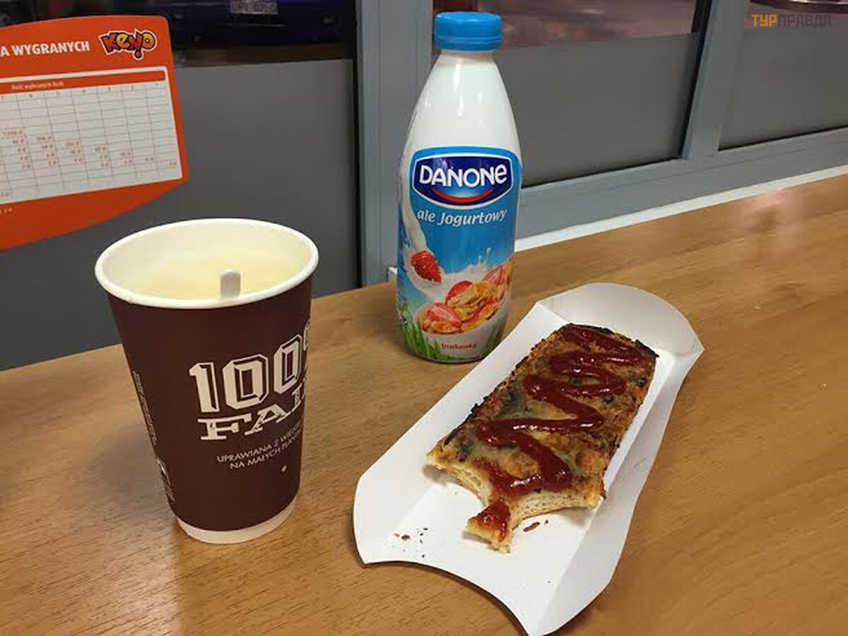 Mū sų pavė luota vakarienė susideda iš.2 didelių latte, 2 didelių jogurtų ir 2 didelių paslaptingų dalykų : su viš tiena ir kaž kuo panaš aus į Margherita picą , tik pagrinde - bandelė s (Vitalikas turi kvieč ių , aš turiu aviž inius dribsnius). Visa tai kainavo 70 zlotų .