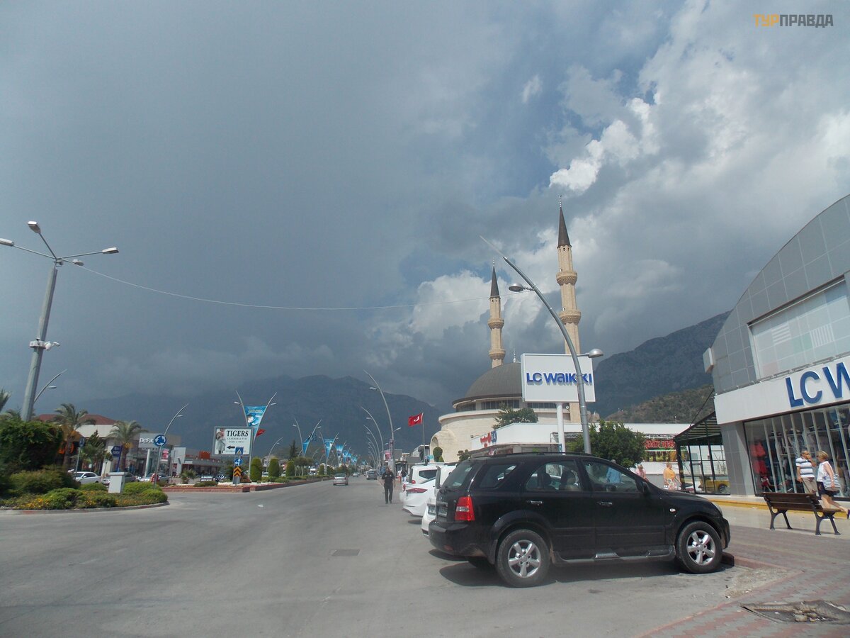 Kai nusileidome į Kemerą , Waikiki apiplė š ti turė jome tik 2 valandas. Oi, kaip man tai nepatinka! Alė joje pamatė me lentelę su fontanais, bet matyt tai buvo ne tas pats Waikiki, kuriame vaikai buvo prieš dieną , todė l į jį nesileidome. Ką daryti, jei tai netinkamas Waikiki ir jie parduoda netinkamus drabuž ius? Ir nuė jome toliau. Rimti tokie debesys buvo į tartinai susikaupę virš kalnų .