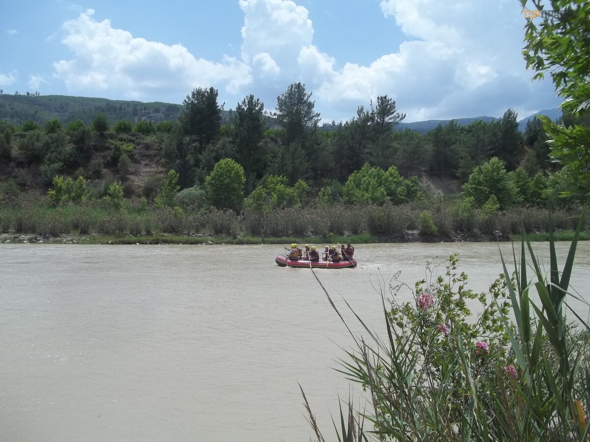 Jie taip pat siū lė skaidrias gumines š lepetes ir taip pat už.5 dolerius (nors gal ir 2). O norintiems buvo pasiū lyta plaukti ne plaustu, o individualiai baidare. Ir taip pat nemokami – penki iš nosies. Deš imt iš valties dviems. Tiesa, norintys eiti, paž iū rė ję vaizdo į raš ą , kiek iš sigando. Tač iau kaž kas vis dė lto jį paė mė . Na, o mes ir likę gobš uoliai apsivilkome gelbė jimosi liemenes ir š almus, pasiė mė me po irklą ir grį ž ome į autobusą važ iuoti į starto vietą . Č ia, kaip paaiš kė jo, buvo finiš o tiesioji. Bet vis tiek pasinaudojau momentu ir iš važ iavau į krantą nufotografuoti upė s. Gana rami upė . Jis labai panaš us į Kaukazo Zelenč uką Arkhyze. Vandens spalva labai graž i.