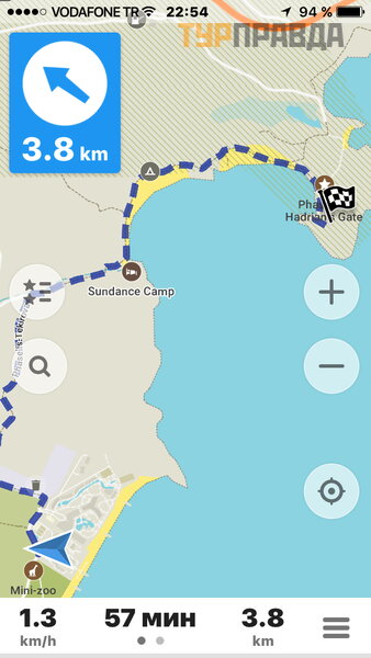 Kelias prasideda Rixos Tekirova vieš buč io gale, už vandens parko.