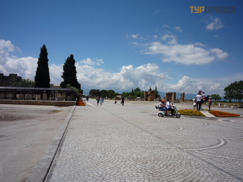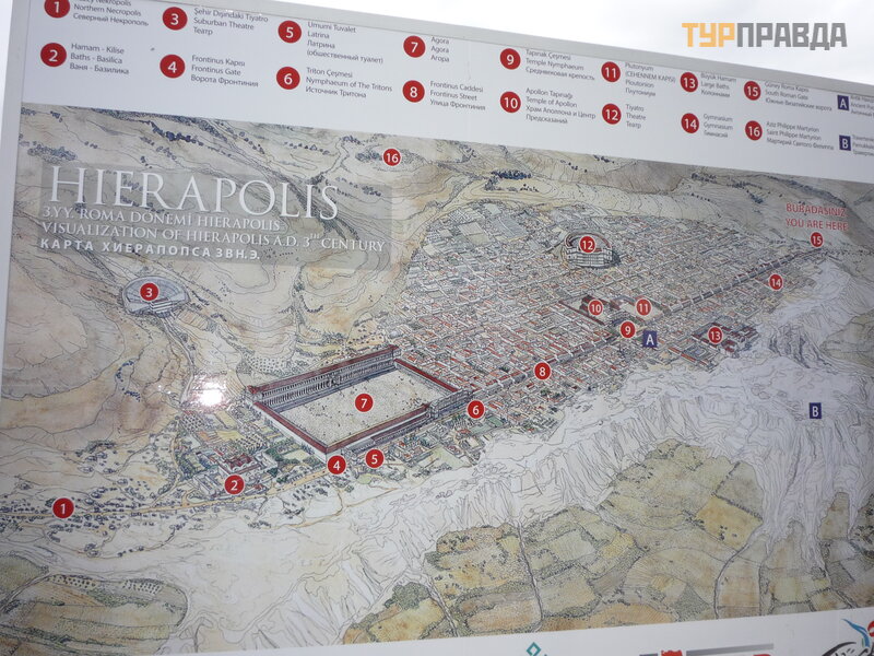 Galite (turė tumė te) pasivaikš č ioti po senovinį Hierapolio miestą . Geros bū klė s yra tokie istoriniai paminklai kaip Romos teatras, į kurtas II a. REKLAMA Š io teatro tribū nos kaž kada talpino iki 15 tū kstanč ių ž iū rovų , pagrindinė je gatvė je yra vaizdinga kolonada, taip pat yra Apolono š ventykla, Plutono š ventovė su grota, Kleopatros pirč ių kompleksas, arkos vartai. Domiciano. Taip pat abiejose kelio pusė se yra skirtingų epochų kapai – tai nekropolis.