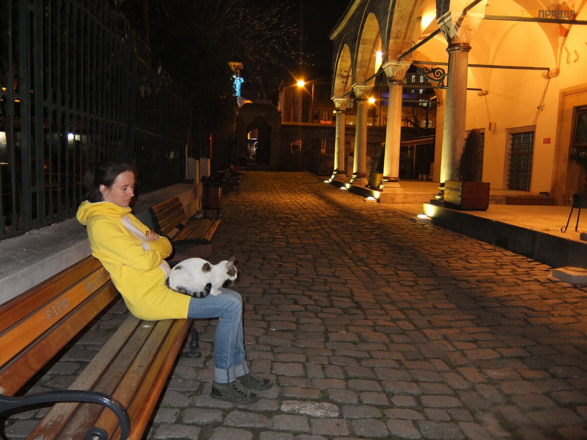 Toliau po saulė lydž io nuvykome į Maž ą ją Sofijos soborą . Prie į ė jimo į maž ą ir labai jaukią meč etę , kurioje nebuvo nė dvasios, mus pasitiko prijaukintas turkų katinas. Į tikinę moteris, kad namo parsivež ti nepavyks, nuė jome apž iū rė ti paskutinė s atrakcijos. Jame suž inojome, kad vieš uosiuose tualetuose vietoj tualetinio popieriaus yra tik č iaupas su vandeniu ir litro puodelis. Mes keturiese susispietė me prie vienos kabinos ir aptarė me, kaip š i sistema veikia. Kai kurie buvo tikri, kad už sienietis to padaryti negali, nes. Vienalaikis dviejų rankų judesių koordinavimas turi bū ti lavinamas nuo vaikystė s. Jau ruoš ė mė s atlikti tiriamą jį eksperimentą , bet mus sutrukdė iš sigandę s turkas, kuris atsargiai ir didelė mis akimis ž vilgtelė jo iš antrosios kabinos.
