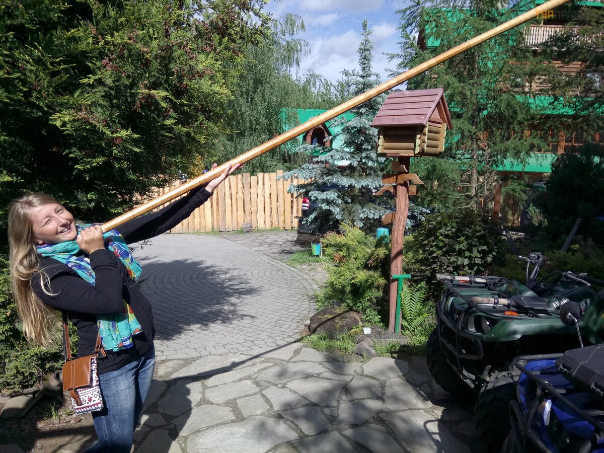 Po to nuvykome į vieš buč io kompleksą "Meš kos bokš tas" – tai vienas š auniausių kompleksų Slavske. Č ia galite pasiklysti savaitei! Č ia yra virvių parkas, baseinas, š audykla, daž asvydis, „Kryivka“, mini zoologijos sodas, pirtis, restoranai. Svarbiausia, kad viskam už tektų laiko ir biudž eto!