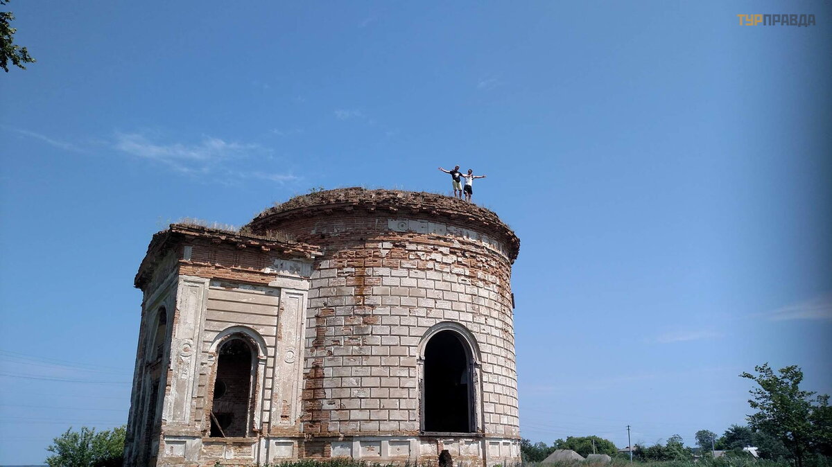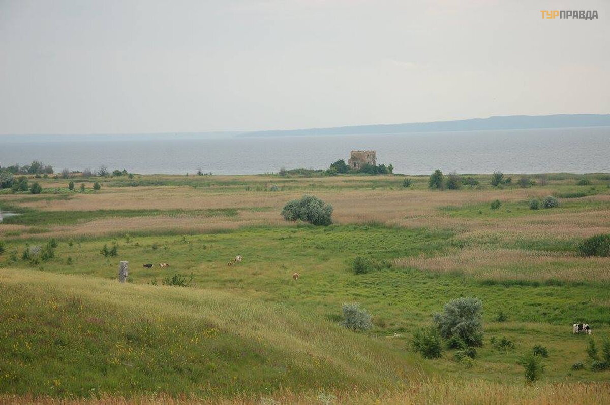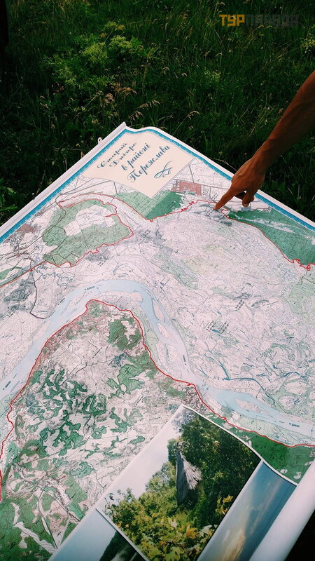 Po tuneliu nuė jome į apž valgos aikš telę kaime. Svogū nai. Iš š ios unikalios vietos galima pamatyti ne maž iau unikalią senojo už tvindyto Tsybli kaimo baž nyč ią , kazokų kryž ių , Trachtemiro pusiasalį , vietą , kur Tarasas Š evč enka paraš ė pagrindinius savo kū rinius ir daug daugiau.