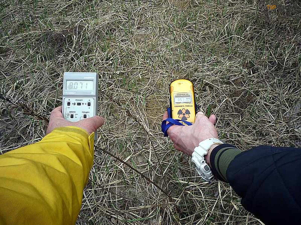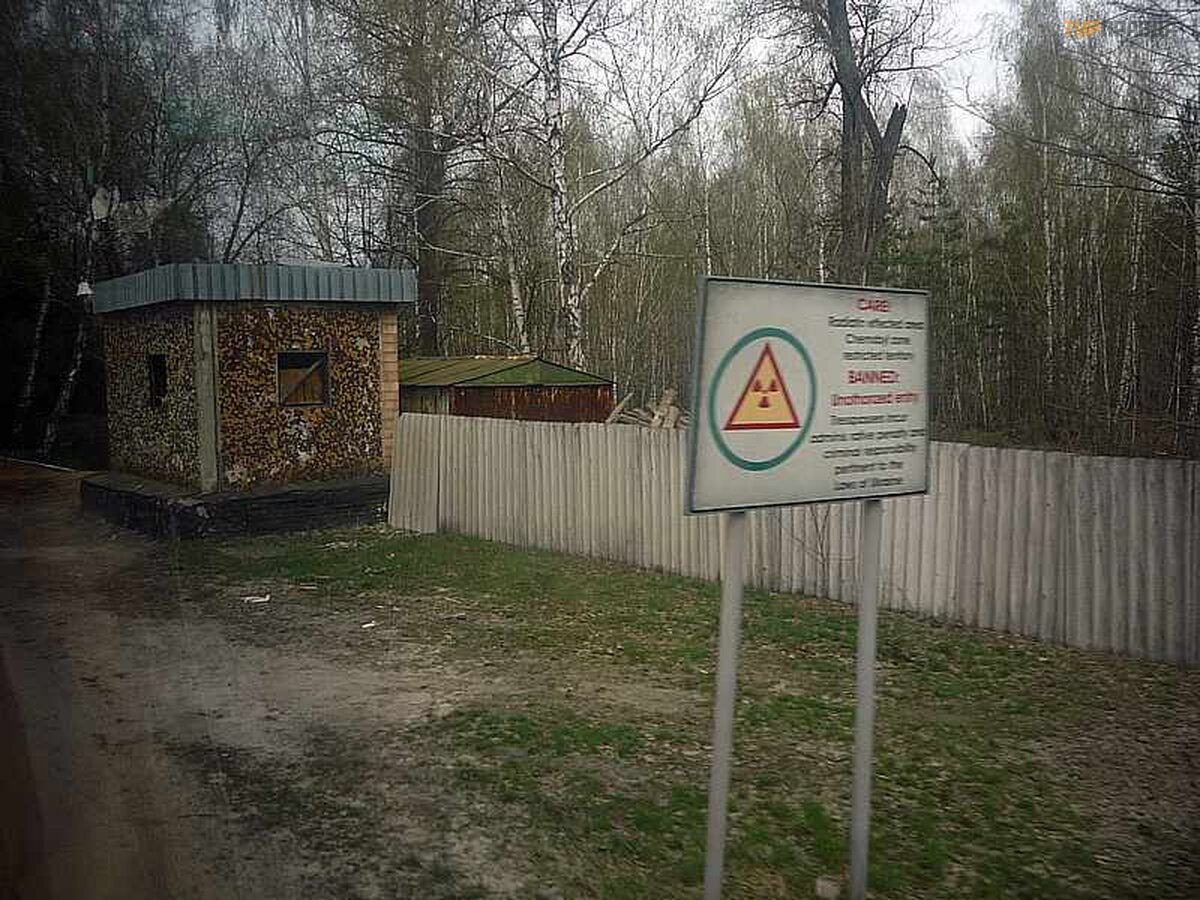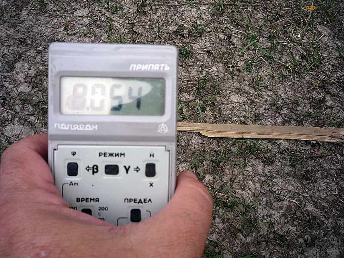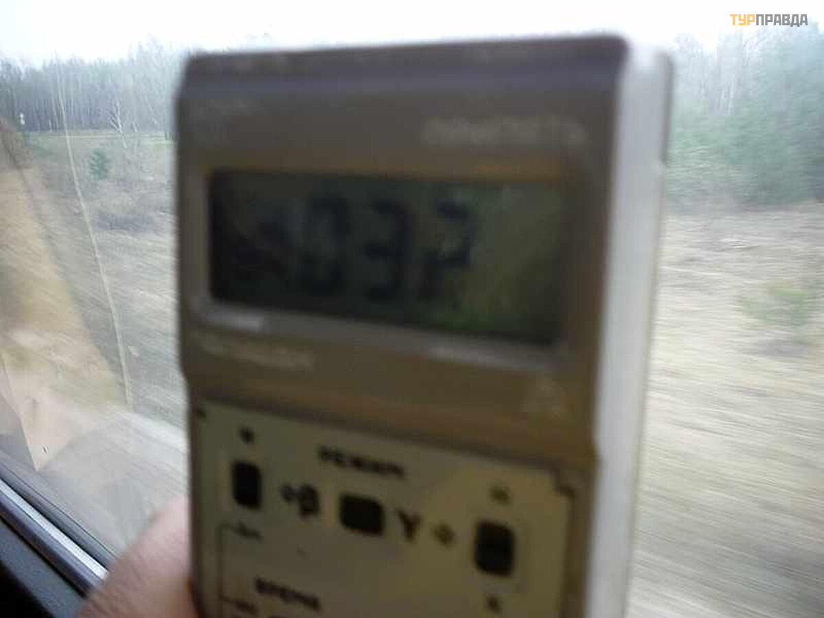 Š ioje vietoje esantys dozimetrai tiesiog už springsta. Ir tai net neiš lipus iš autobuso, keliaujant. Kaž kaip nelabai malonu matyti rodiklio skaič ius, virš ijanč ius 1000 mikrorentgenų per valandą . Palyginimui, Kijeve fone yra apie 15 mikro-rentgenų per valandą . Gerai, kad š i atkarpa nė ra plati, tik du ar trys š imtai metrų .