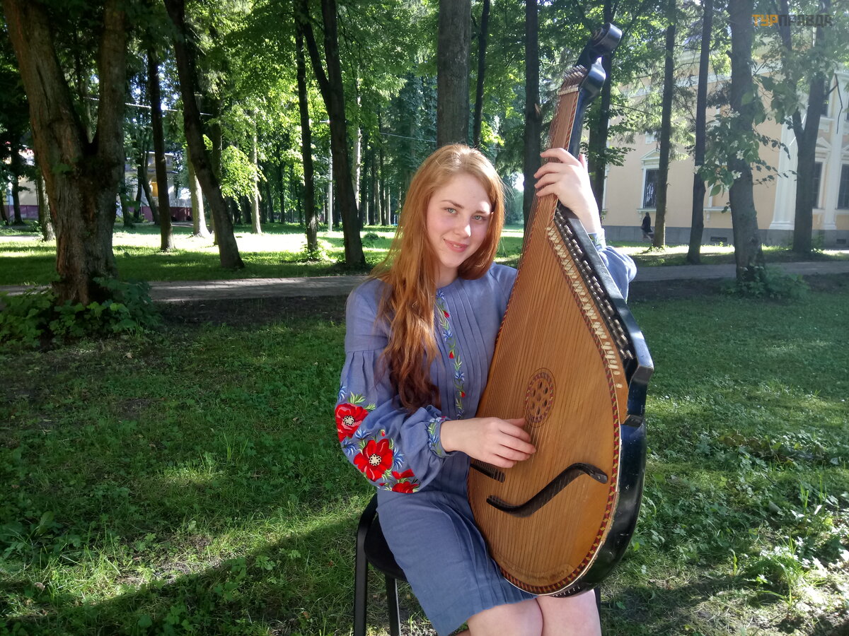 Prie į ė jimo mus pasitiko graž i mergina, kuri mums grojo bandura ir dainavo nuoš irdž ią dainą .