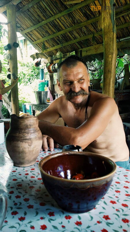Jie paklausė , ką jis veikė kitą dieną , sakydami, kad jis saugo š ventovę . Ir sako, kad niekada „nedirbo“, nes „darbas“ kilę s iš ž odž io vergas, be to, jis yra laisvas ž mogus. Beje, Olegas kalba rusiš kai ir vadina save iš civilizacijos pasitraukusiu „atskyrė liu“, ukrainietiš kai atitinkamo ž odž io nė ra, o atsiskyrė lis jam nepatinka. Sako, kad gyventi padeda draugai ir geri ž monė s. Jis kreipiasi į gydytojus ir turi mobilų jį telefoną , vadinamą jį atsiskyrė lį . Man labai nepatinka, kai spauda viską perdeda, o galvoje į sivaizduoji tokį atsiskyrė lį š amaną , o ateini ir pamatai dė dę , kurią tiesiog iš viliojo miestas. Gerai tai, kad Olegas skatina meilę gamtai.