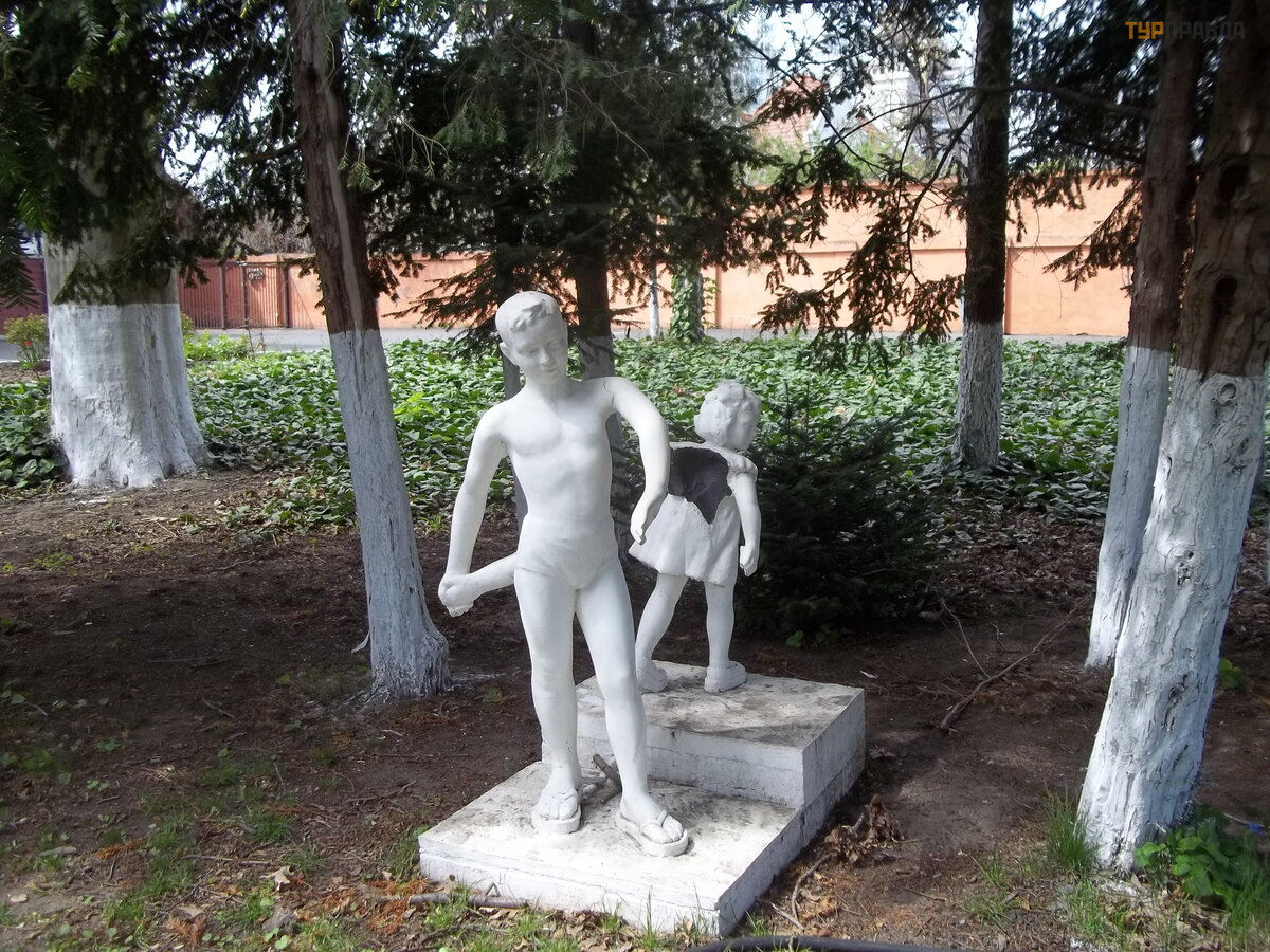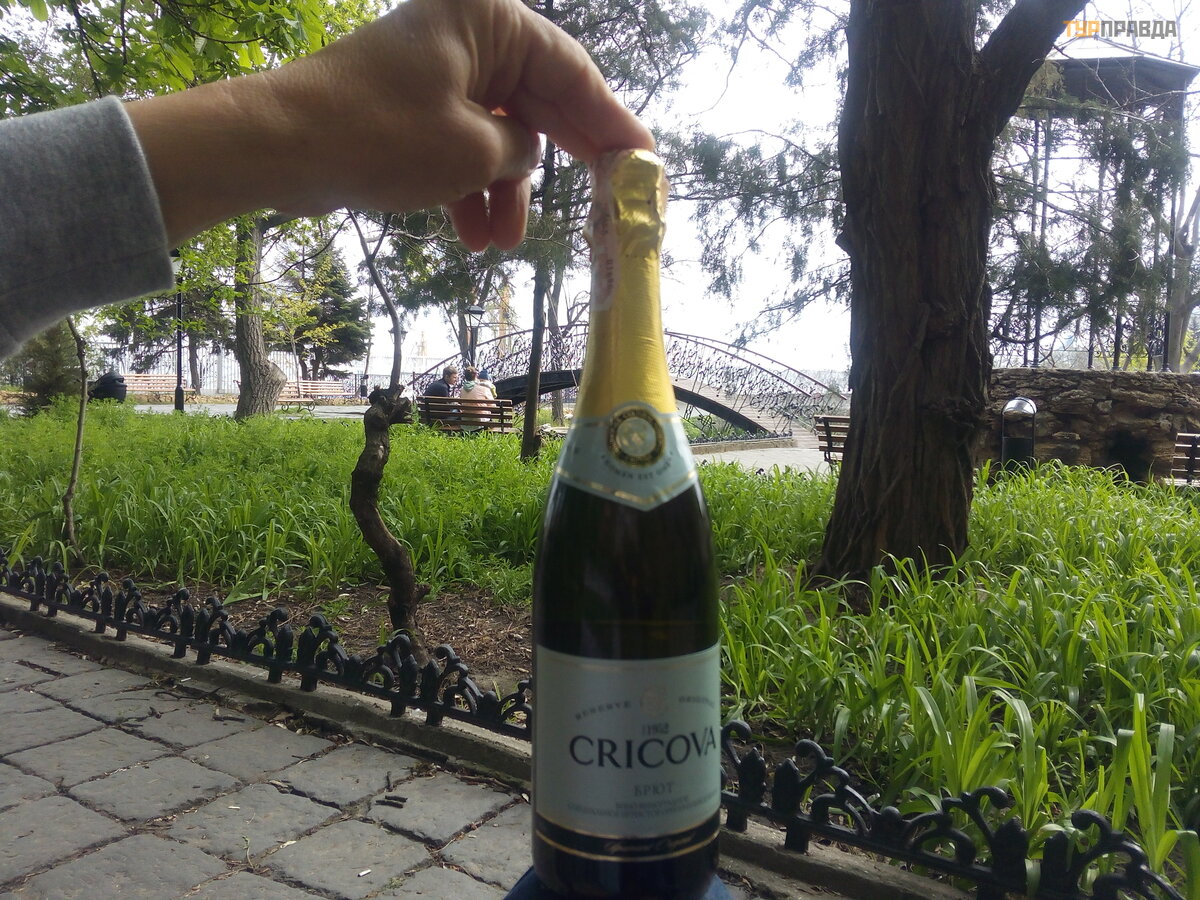 Ne, mes ž inojome, kad Odesos š ampanas yra retas bjaurumas, bet yra ž uvis, nes trū ksta ž uvies ir vė ž io! Nuė jome į jų į monė s parduotuvę , esanč ią ramioje ž alioje gamyklos vietoje. Nedvejodami nusipirkome muskato rieš uto butelį už.70 UAH. Ir kur tu jį gertum? Gal grį ž ti į skylę tvoroje ir palipti po kokiu nuoš aliu botanikos sodo krū mu? Vadikas pasiū lė iš gerti č ia pat, neiš lipę s nuo kasos. Taigi po kukmedž iu stovi suoliukas, š alia skulptū rinė kompozicija, matyt, simbolizuojanti vaikų alkoholizmo ž alą .