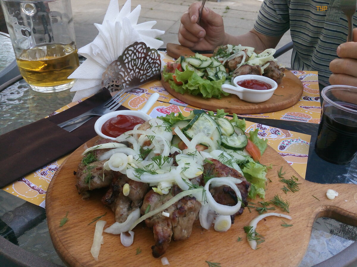 Jau buvome visai sveiki ir iš ė jome pasivaikš č ioti. Gerai, kad bandž iau ką nors nufotografuoti, kitaip nieko neprisiminč iau. Gruzinų į staigoje už sisakė me avienos kebabą ir pilstomą Mikulin alų . Mė sa buvo ant š onkaulių . Visiš kai bekvapis. Mes niekada jo neidentifikavome. Bet tai ne ė riena. Ne kiauliena, ne jautiena. Nufotografuoti niekam nepasiteisino. Bet mes nepamirš ome katė s.