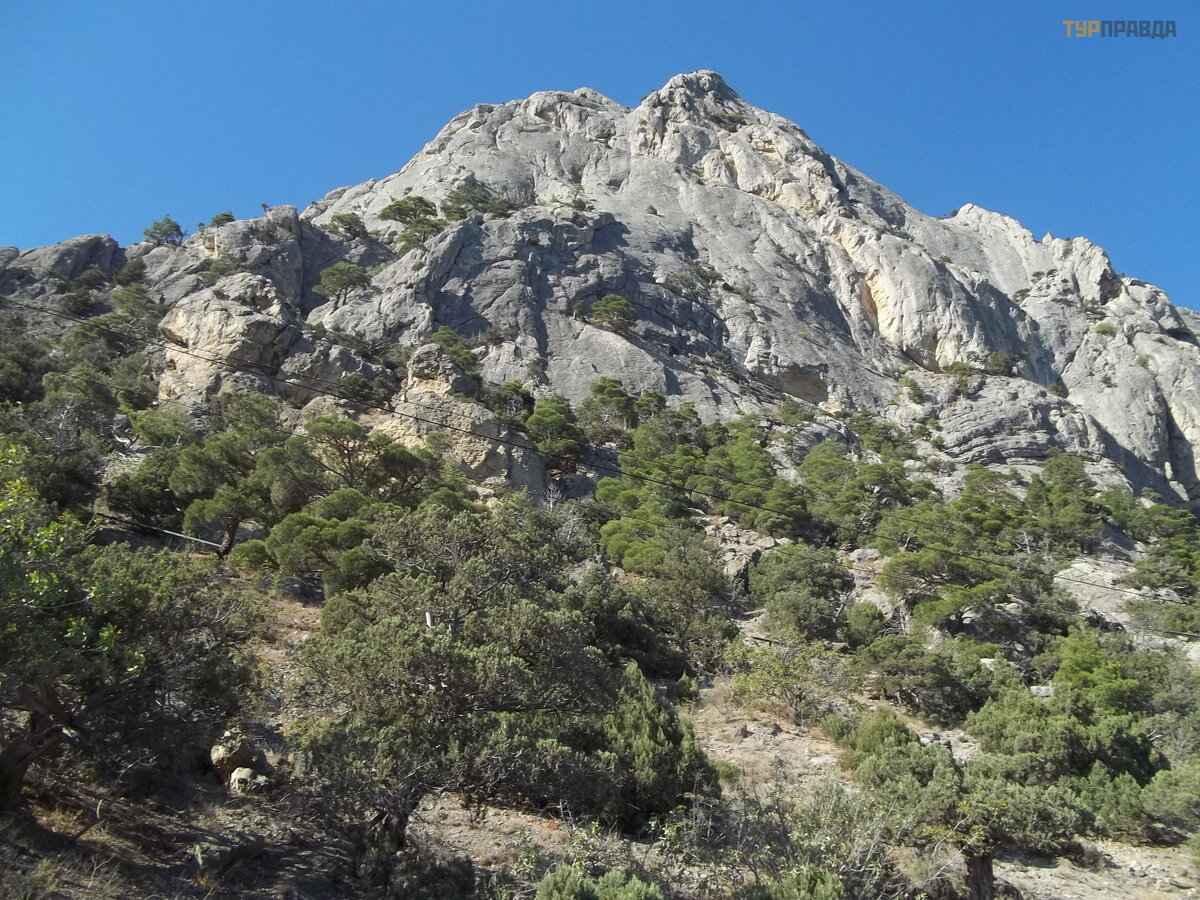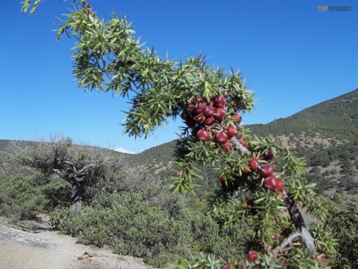 Iš saugoję š iukš les, pradė jome kopti į Sokolą . Jei atvirai, buvau apsvaigę s. Kai buvau jaunas ir neapgalvotas (apie 30 metų ), kasmet lipdavome į jį , eidavome ketera per stač ią uolą , o paskui kularu nusileidome į Novy Svet kelią arč iau Sudako. Bet paskutinį kartą (2013 m. ) pagalvojau, kad ten jau nebelipsiu už jokius meduolius. Pač iame virš uje akmenys taip nulaiž yti, kad nebuvo nė menkiausio sunkumo į skristi į bedugnę – vienas neteisingas ž ingsnis, ir pavirsti beforme kruvina krū va papė dė je. Tač iau į virš ų vyksta ekskursijos su gidu! Koks į domus kelias? Paprastas turistas tą kartą nebū tų praė ję s ten, kur buvome aptrupė ję . Ten daug takų . Kuris yra saugus? Ė jome tuo, kuris patogesnis, ir sutryptas. Pakeliui pasiė mė me kadagio krū mą , ryš kiai apibarstytą uogomis.