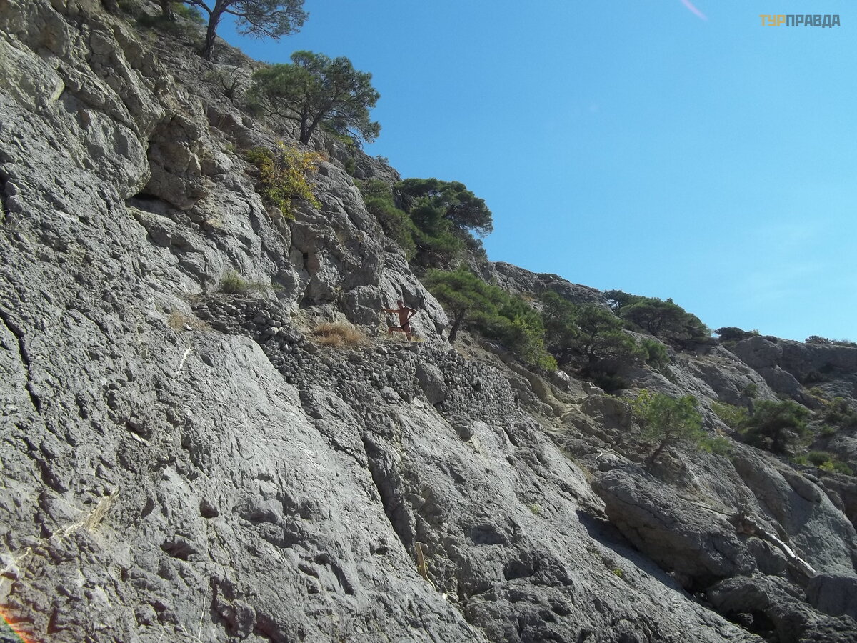 Bet tai buvo seniai. Laikui bė gant dalis tako sugriuvo ir juo beveik niekas nevaikš č iojo. Beveik. Mes einame. Dabar reikė jo nusileisti prie vandens toje vietoje, kur jis sugriuvo, o tada lipti atgal.