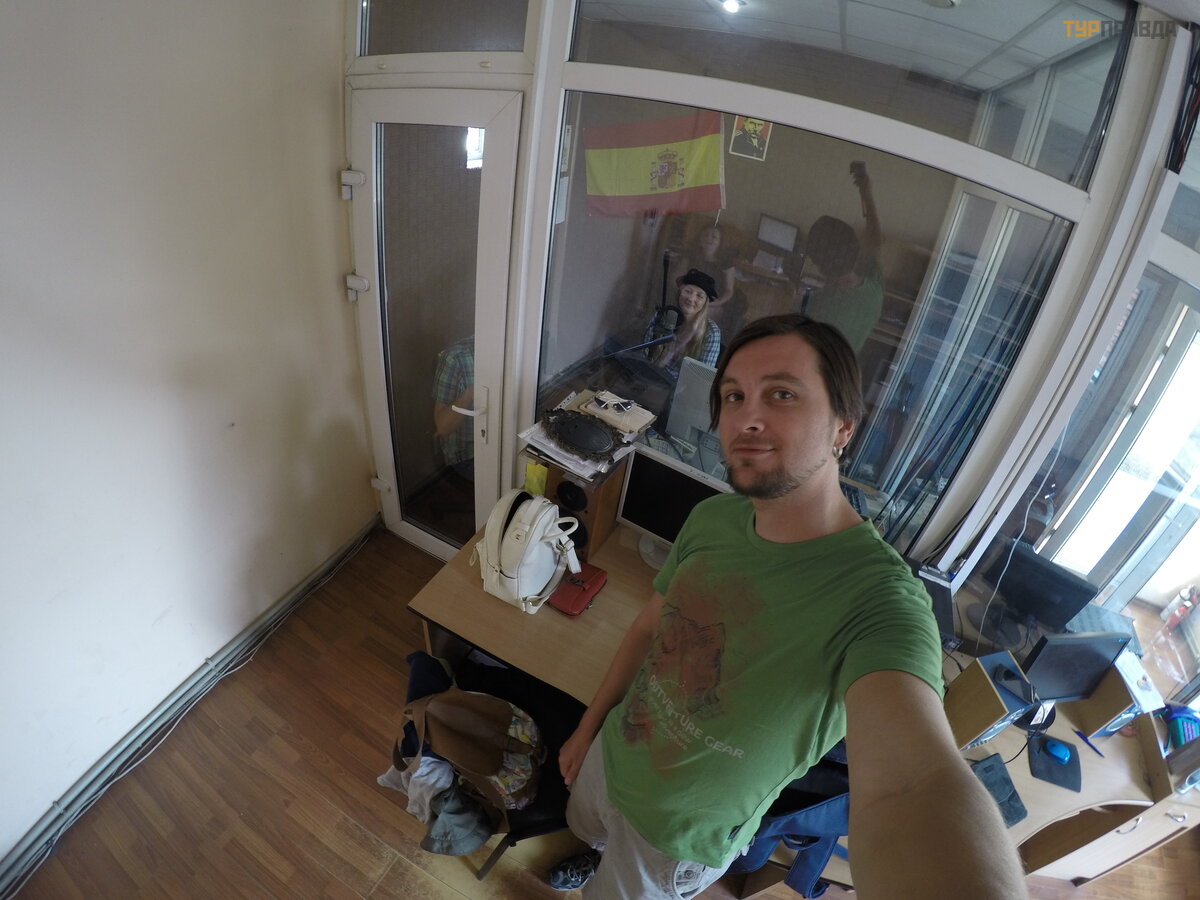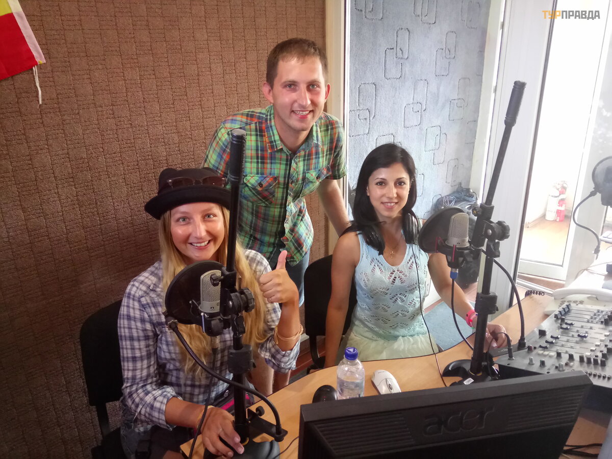 Ir iš kart iš laivo į balių – tiksliau, tiesioginę transliaciją per radiją . Ekskursijose Už gorode buvome pakviesti pabė gioti per rytinį radiją ir pasidalinti į spū dž iais apie ekskursijos pradž ią . Bet patekome net ne į vieną radiją , o į tiesiogines dviejų radijo stoč ių transliacijas iš karto: Zakarpattia Radio ir Svit FM Radio. Ir kol Serhiy per vieną radiją kalbė jo apie projektą Embroidery Way, aš tuo pat metu per kitą .
