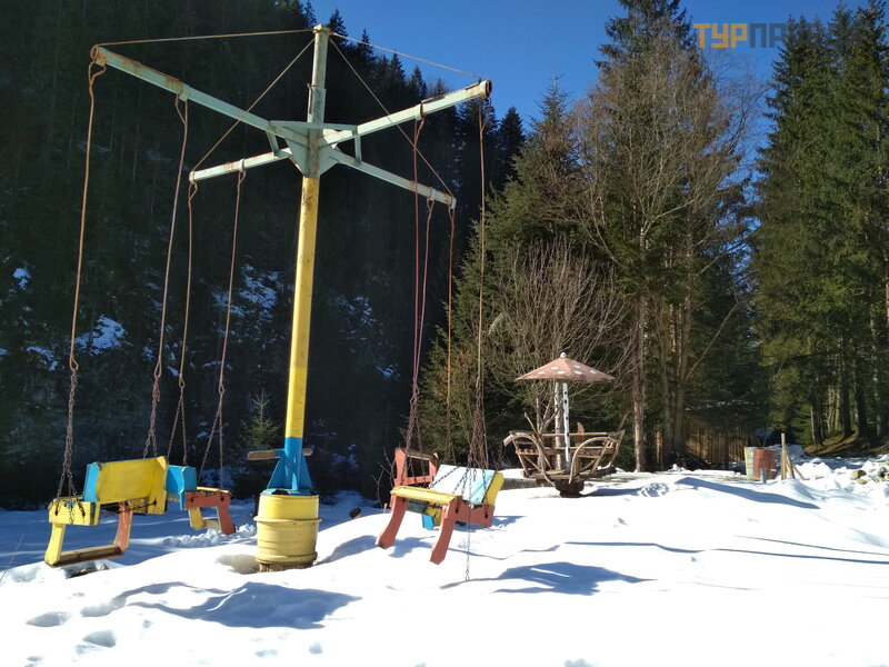 Хотя, по словам проводившего экскурсию водителя, зимой количество маршрутов ограничено из-за глубокого снега в горах, но посмотреть, все равно, есть что. По заснеженному лесу нас довезли до телевизионной вышки, установленной на одной из гор еще в советское время. Ехать не очень комфортно, особенно если в автомобиле 4 пассажира, но интеересно. От вышки при ясной погоде открывается вид на горы Говерлу и Рокиту. Можно сфотографировать на фоне зимних Карпат. Единственное, что мешает – сильный холодный ветер.