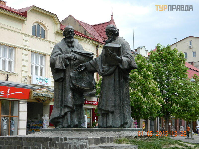 Дальше мы почтительно помолчали возле памятника основоположникам славянской письменности Кириллу и Мефодию: