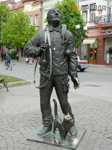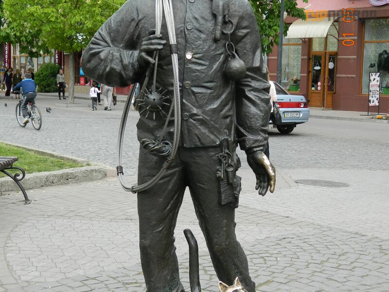 Он (памятник) чуть выше мужчины среднего роста. А прототип – мукачевский трубочист Берталон Товт – в жизни в 2 раза меньше (!). А как же еще пролезешь в дымоход?! Не знаю, байка это или нет, но говорят, что когда городские власти обратились к нему с предложением создать в его честь памятник, единственным условием Товта было, чтобы памятник был нормального роста. Трубочист жив, и, несмотря на почтенный возраст (ему под 70 годочков уже), по сей день продолжает чистить дымоходы горожан. Считается, что встретиться с ним живьем и ухватить его за пуговицу – к удаче :).