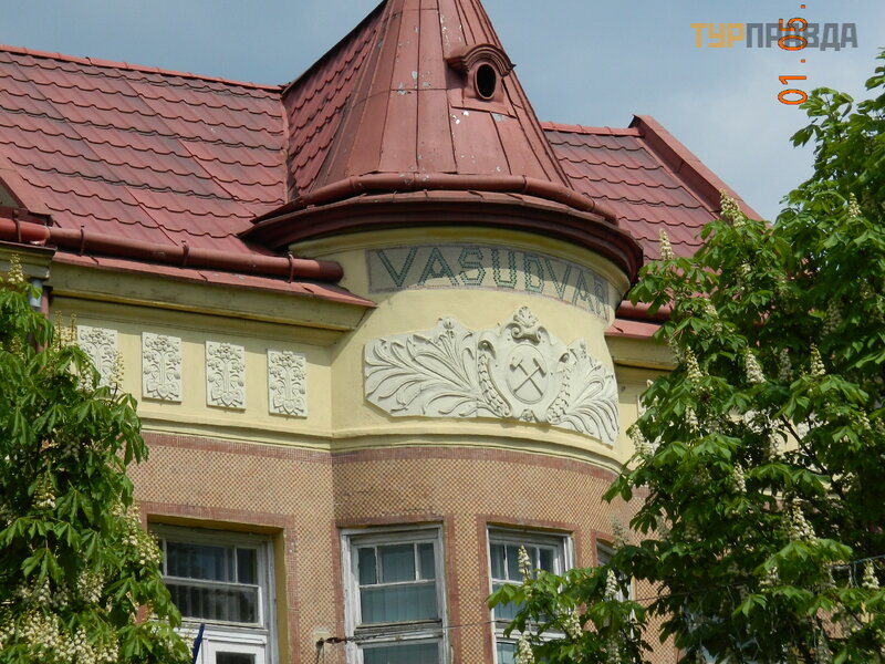 А вот еще интересный архитектурный объект. Дом с Гермесом на крыше - это бывшая типография предпринимателя Гринштейна. По легенде, Гринштейн выиграл в Европе то ли в казино, то ли в лотерею миллион, и на эти деньги построил типографию. На то время это была одна из самых прогрессивных типографий Закарпатья.