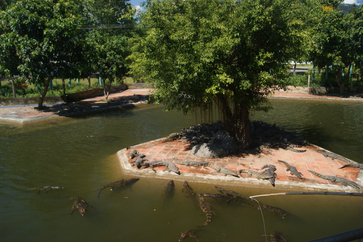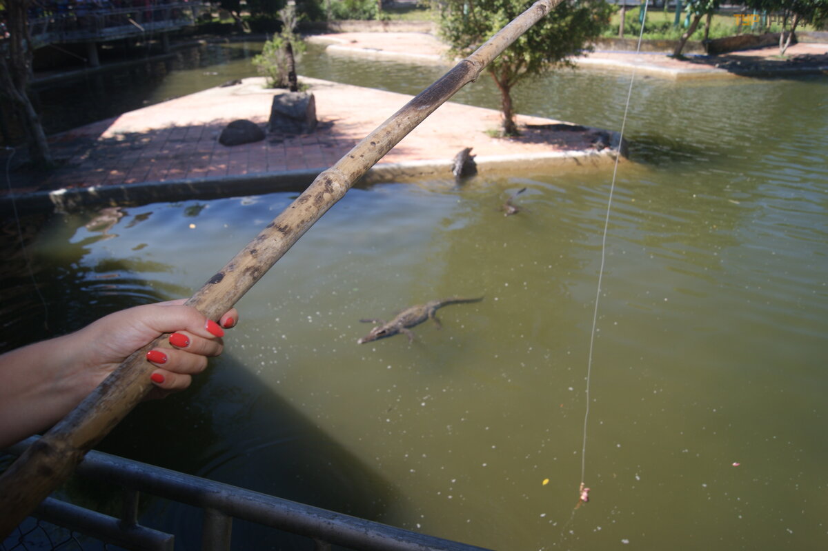 Tada nuė jome į krokodilų fermą . Yra daug maž ų krokodilų , besikaitinanč ių saulė je arba tingiai plaukianč ių vandenyje. Galite juos pamaitinti, ū kio darbuotojai iš dalina meš keres su mė sos gabalais.