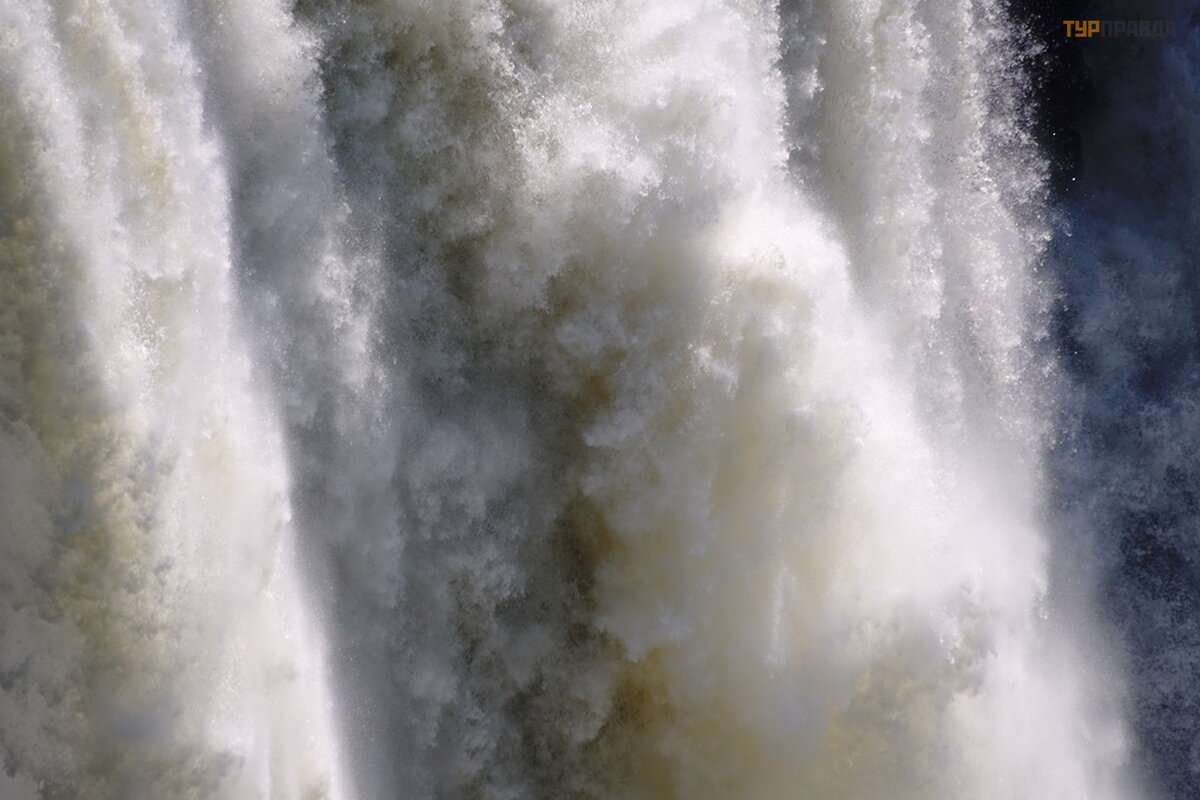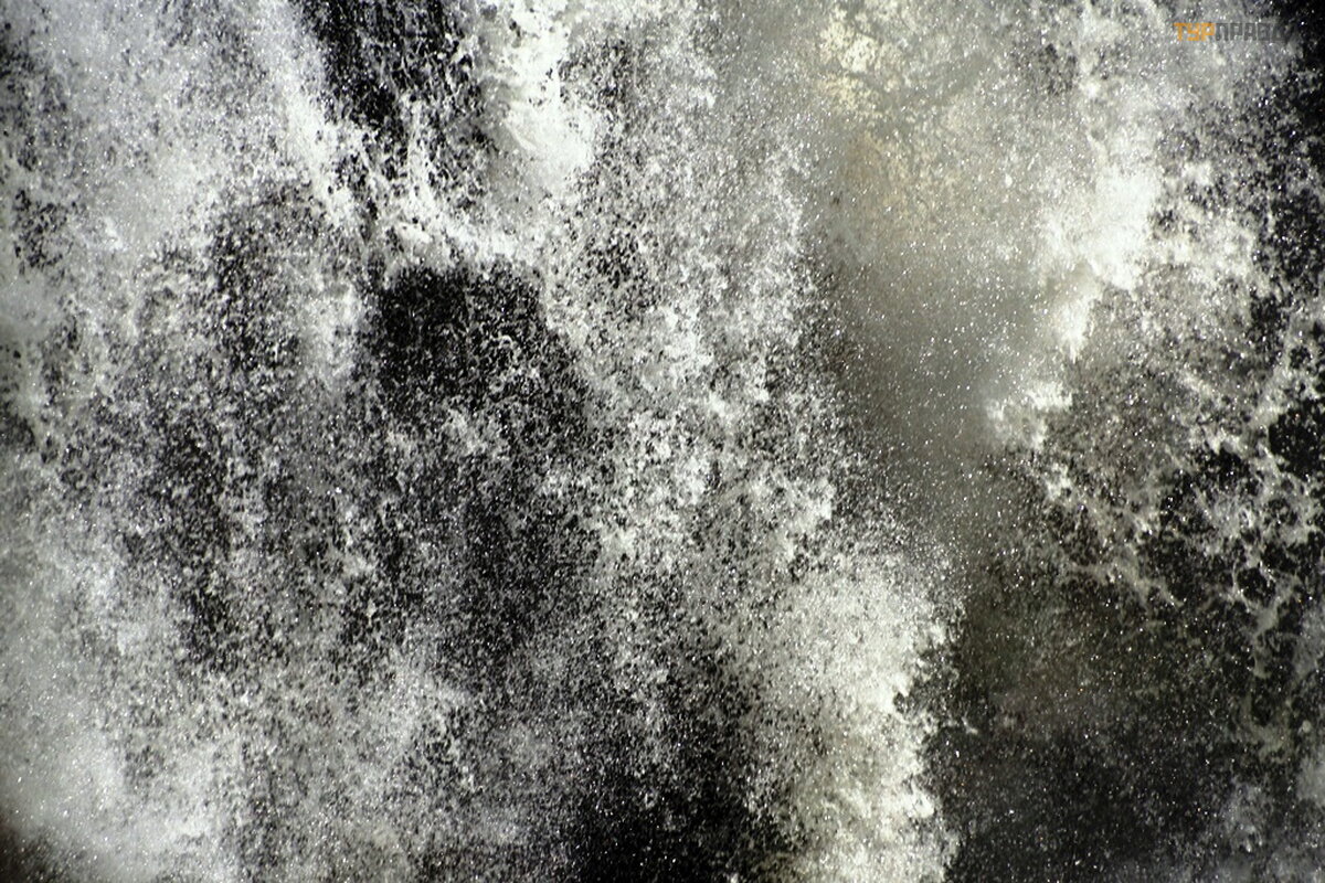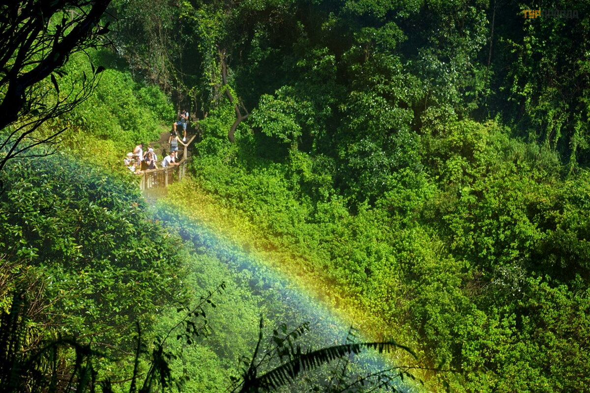 Smagu klaidž ioti po parką tarp didelių medž ių . Vandens dulksna drė kina ir vė sina orą . Į parką atė jau ryte, bet reikia po pietų , vė lyvą popietę , kad krioklį nuš viestų saulė . Vandens dulkė s ypač apsunkina fotografavimą . Dar viena akimirka. Krioklys negilus. Lietaus sezonas dar neatė jo.