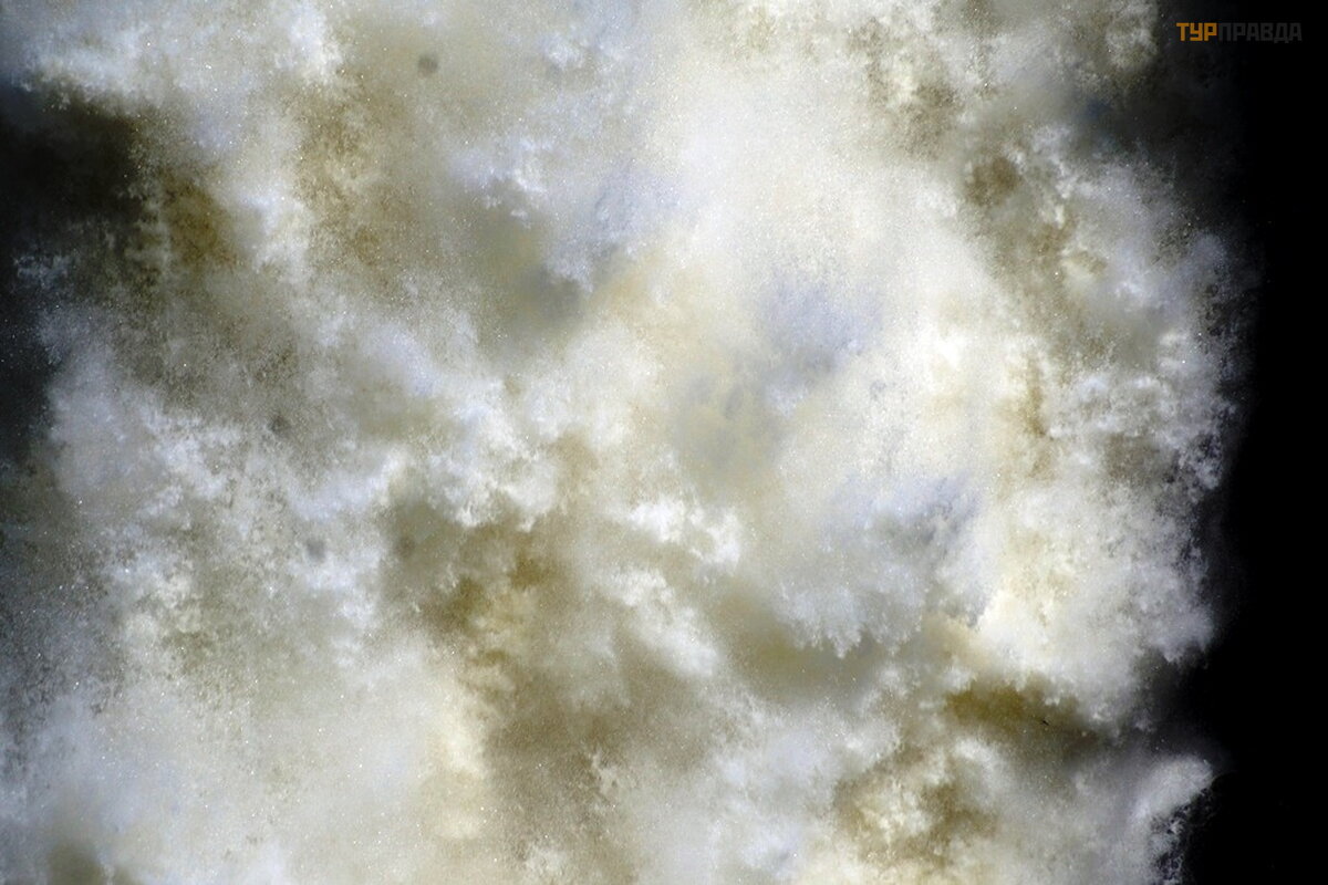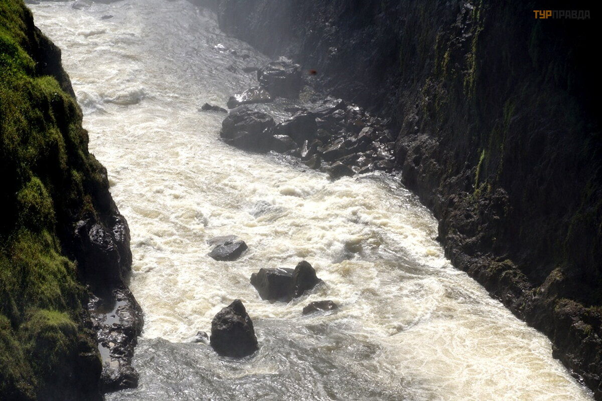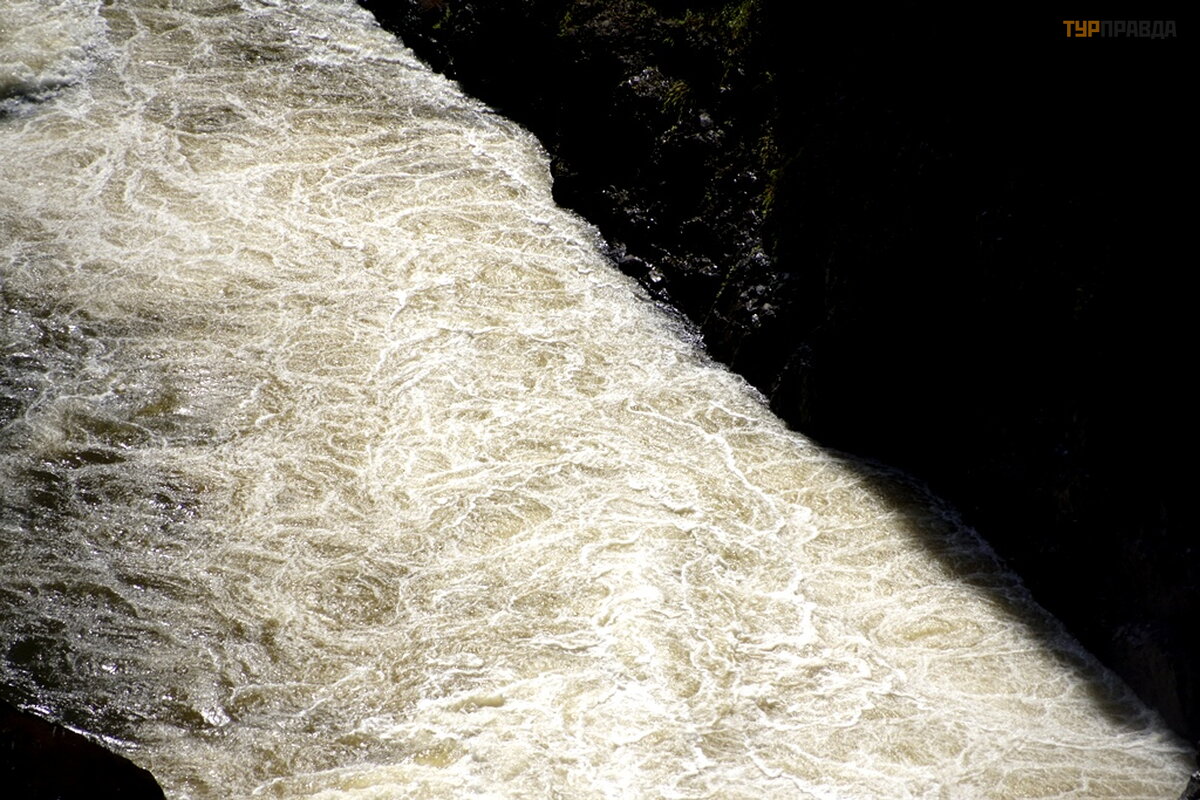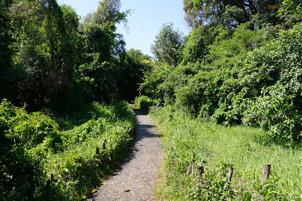 Smagu klaidž ioti po parką tarp didelių medž ių . Vandens dulksna drė kina ir vė sina orą . Į parką atė jau ryte, bet reikia po pietų , vė lyvą popietę , kad krioklį nuš viestų saulė . Vandens dulkė s ypač apsunkina fotografavimą . Dar viena akimirka. Krioklys negilus. Lietaus sezonas dar neatė jo.