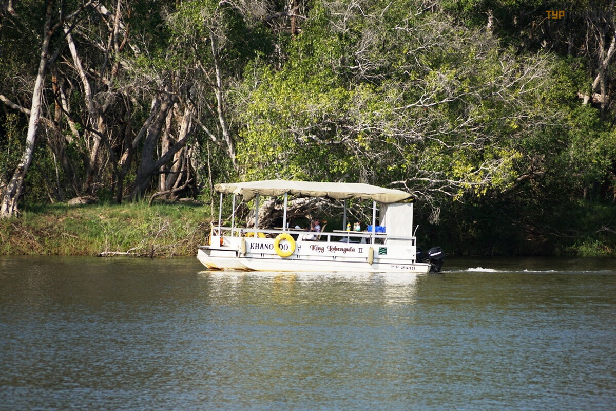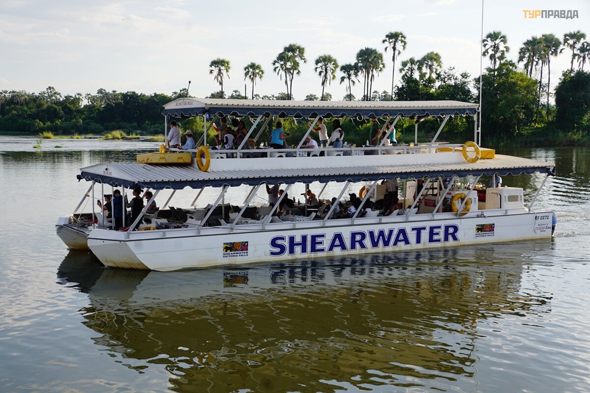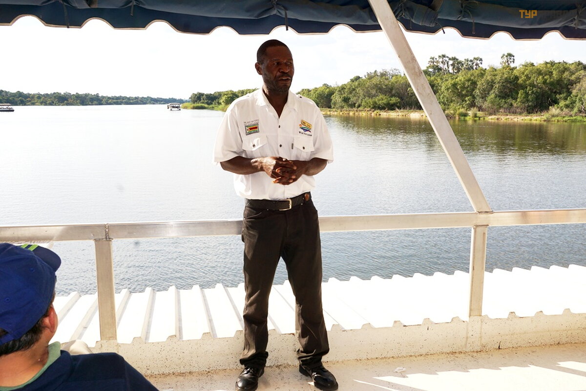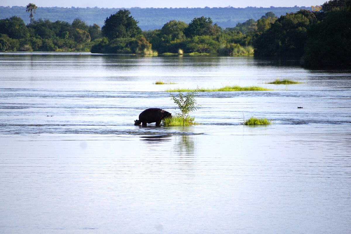 Pirmą ją atvykimo į Viktorijos krioklį dieną už sisakiau vakarinį pasivaikš č iojimą Zambezi upe , iš ilgai dviejų Afrikos š alių Zimbabvė s ir Zambijos. Pasivaikš č iojimas kainuoja 40 dolerių , bet buvo ir ranka raš ytas raš telis plius 10 dolerių . Už ką , nesupratau. Galbū t tai yra padė ti badaujantiems Afrikos vaikams arba naudotis tualetu einant palei upę , kurios vandenį jie filtruos paskui mus.