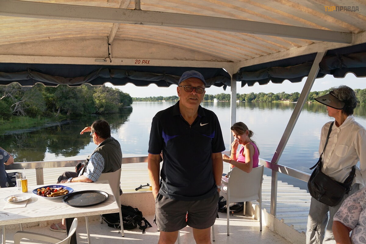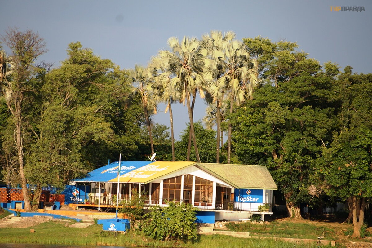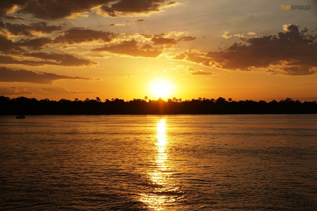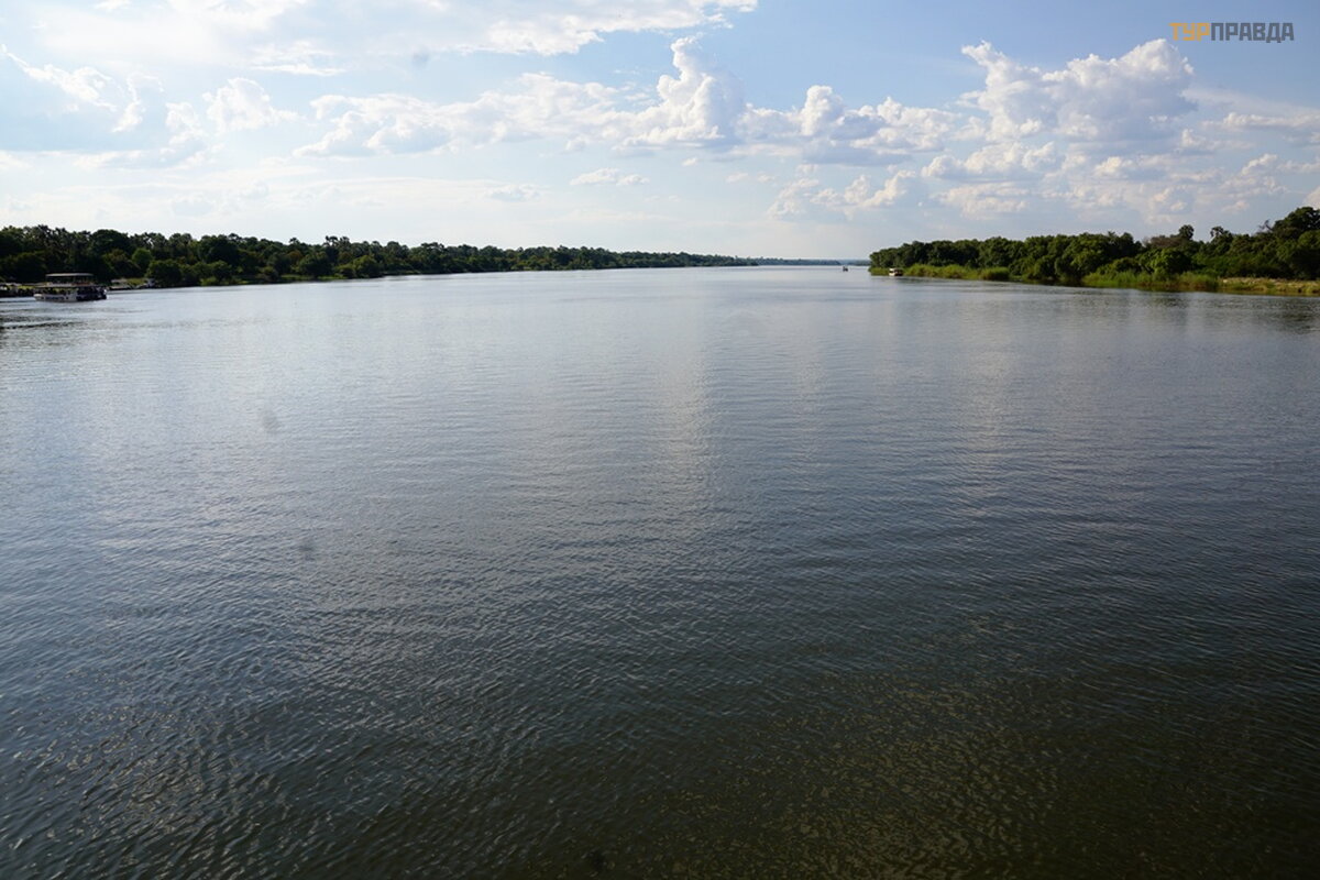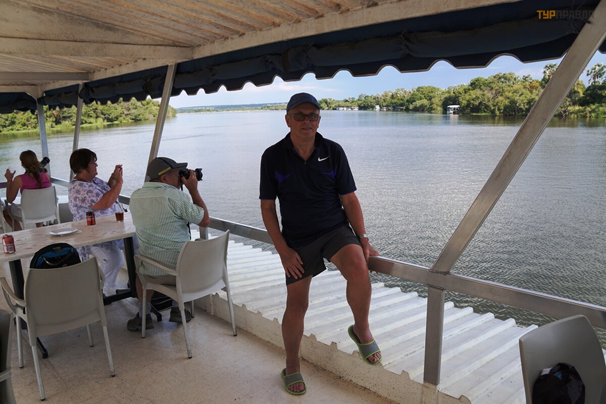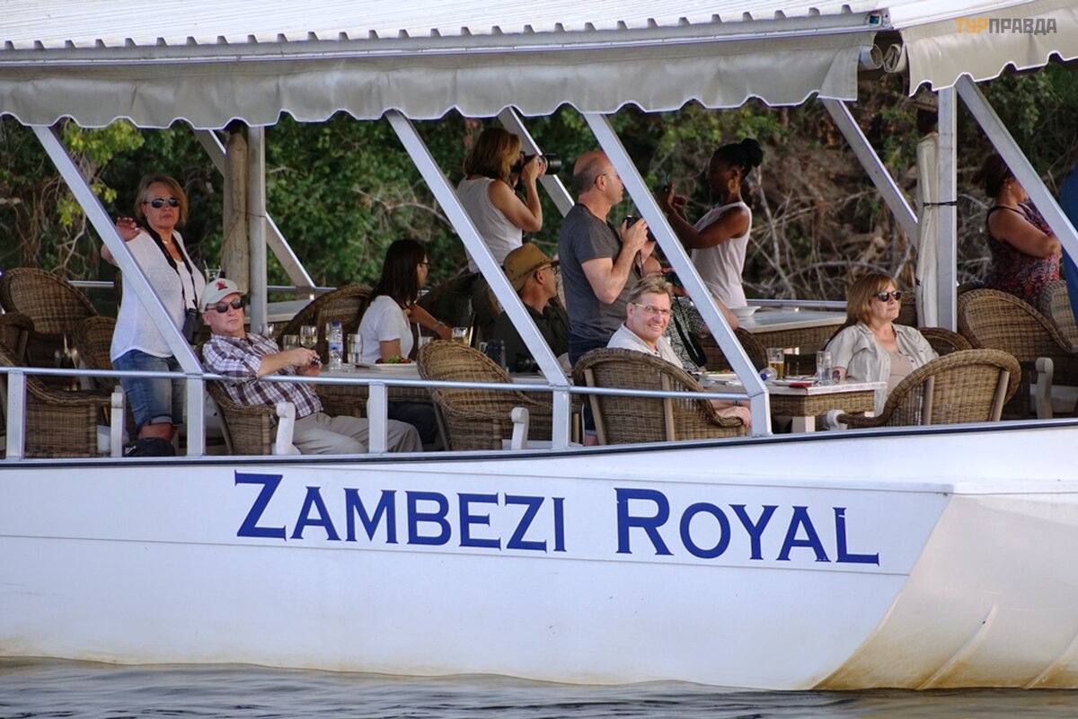 Upė je buvo tokia tyla, kad girdė josi oro skambesys ir upė s š nabž desys. Variklių visai nebuvo. Ač iū už tai ž ygio organizatoriams. Laivo baras buvo prikrautas visokių alkoholinių gė rimų ir gė rimų . Aš , kaip negeriantis, už sisakiau padavė jui viskio su ledukais, paskui dž ino ir konjako su citrina. Nusprendė iš bandyti vietinius nuodus. Tada iš ė jo gidas ir papasakojo apie š ių vietų grož į , kad upė s deš inė je yra Zimbabvė , o kairė je - Zambija. Tolumoje, sako, Viktorijos krioklys. Jis kalbė jo apie gyvas bū tybes ir paukš č ius, aptinkamus Zambezi upė s pakrantė se. Grož is yra nepaprastas. Tyla, iš skyrus blyš kių veidų š urmulį . Jū s gurkš nojate viskį ir apsiž valgote.