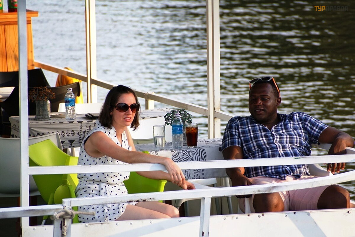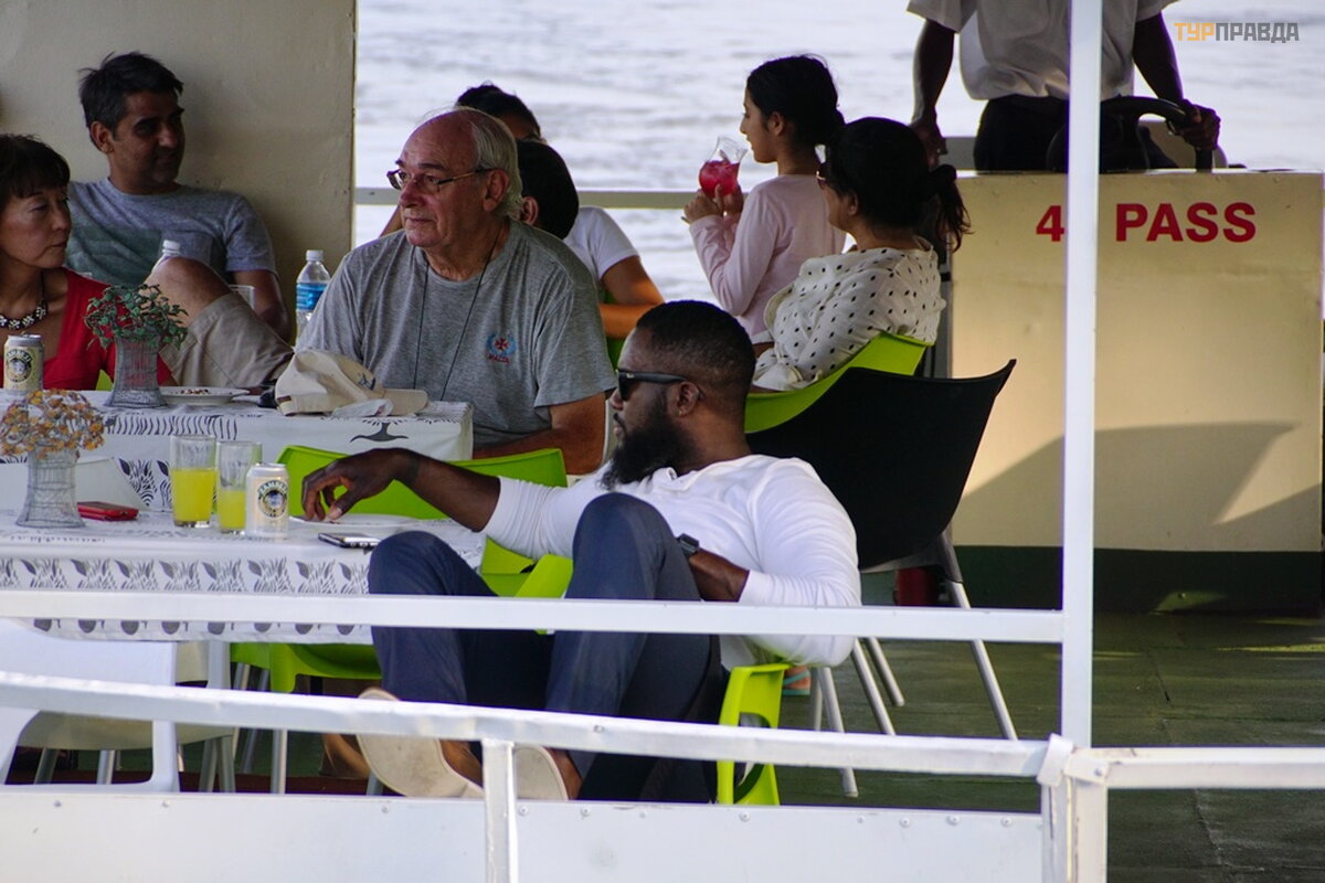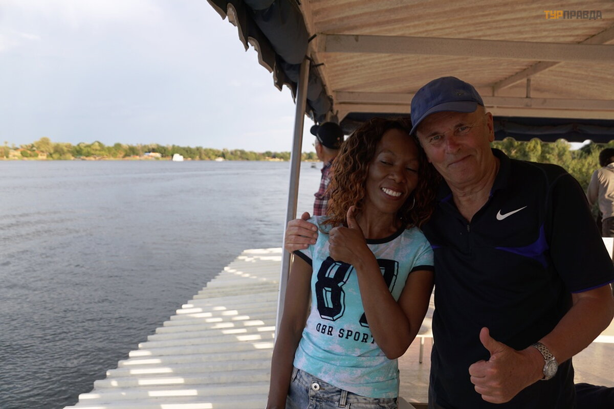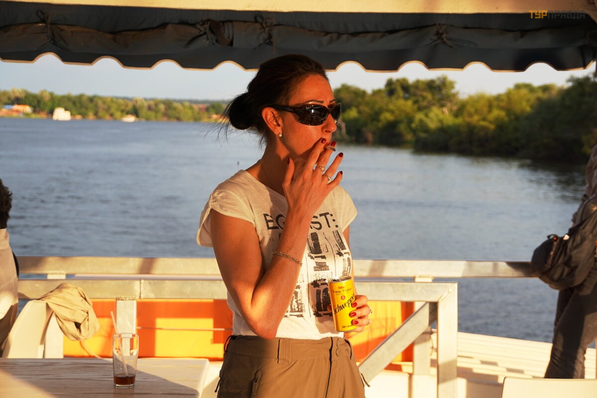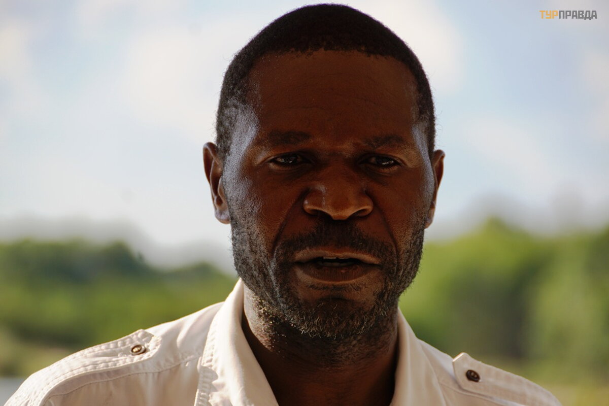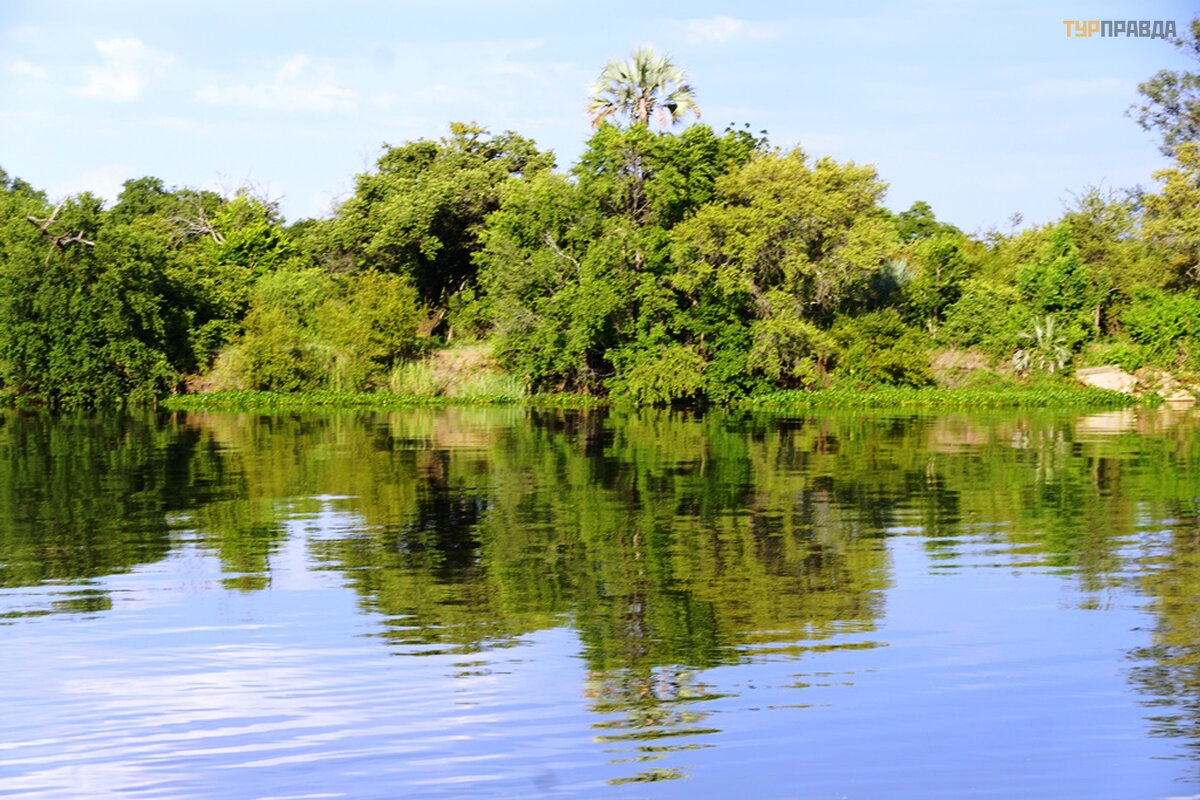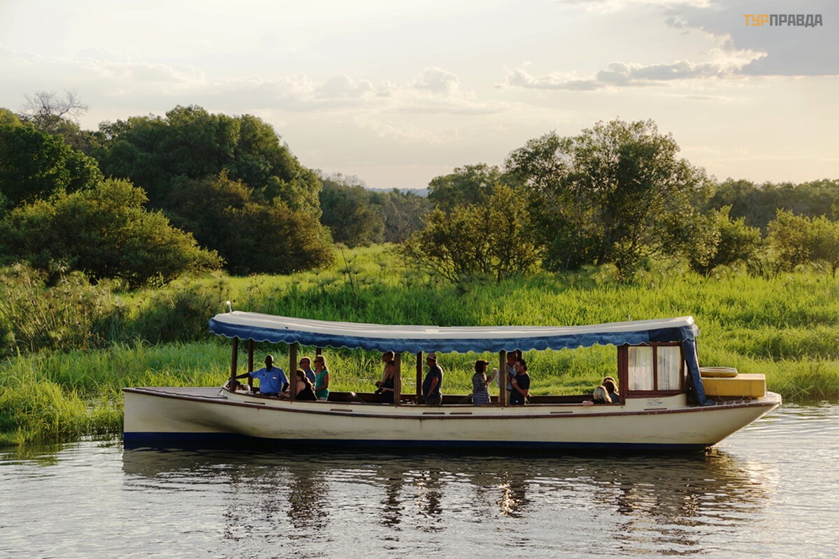 Upė je buvo tokia tyla, kad girdė josi oro skambesys ir upė s š nabž desys. Variklių visai nebuvo. Ač iū už tai ž ygio organizatoriams. Laivo baras buvo prikrautas visokių alkoholinių gė rimų ir gė rimų . Aš , kaip negeriantis, už sisakiau padavė jui viskio su ledukais, paskui dž ino ir konjako su citrina. Nusprendė iš bandyti vietinius nuodus. Tada iš ė jo gidas ir papasakojo apie š ių vietų grož į , kad upė s deš inė je yra Zimbabvė , o kairė je - Zambija. Tolumoje, sako, Viktorijos krioklys. Jis kalbė jo apie gyvas bū tybes ir paukš č ius, aptinkamus Zambezi upė s pakrantė se. Grož is yra nepaprastas. Tyla, iš skyrus blyš kių veidų š urmulį . Jū s gurkš nojate viskį ir apsiž valgote.